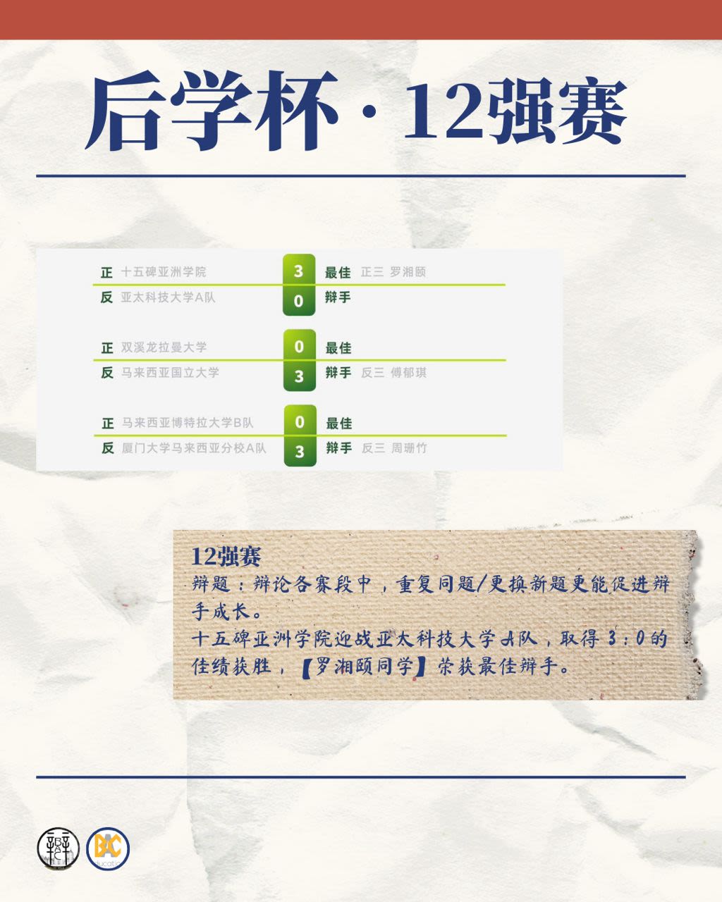 - Round of 12: Win (3–0) | Best Debater: Lo Xiang Yi