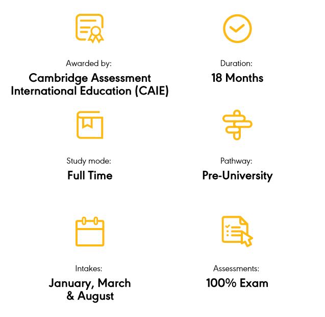 This most recognised pre-University qualification in the world will help you progress onto undergraduate degrees in Accounting, Business, Management, Commerce, Economics, Finance, ICT, Communications, Law, Marketing and Mass Communications, Medicine, Dentistry, Pharmacy, Engineering, Actuarial Sciences, Aviation, Food Sciences, Forensic Science and Biomedical Sciences, among others.