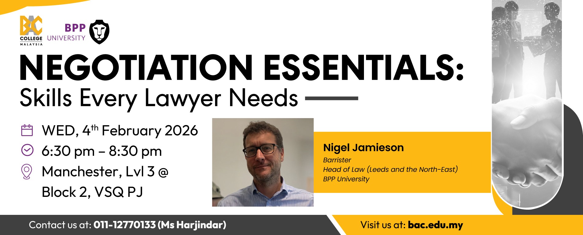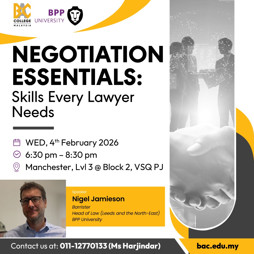 Negotiation Essentials: Skills Every Lawyer Needs 📅 Date: 4th February 2026 (Wednesday) ⏰ Time: 6.30pm – 8.30pm 📍 Venue: Manchester, Level 3 @ Block 2, VSQ PJ Registration Form —Please choose an option— E.g. MY - 1234567890, INTL - 1234567890123 I am a*BAC StudentBAC StaffAlumniOthers By submitting this enquiry, you agree to our Terms & conditions and Privacy Notice.