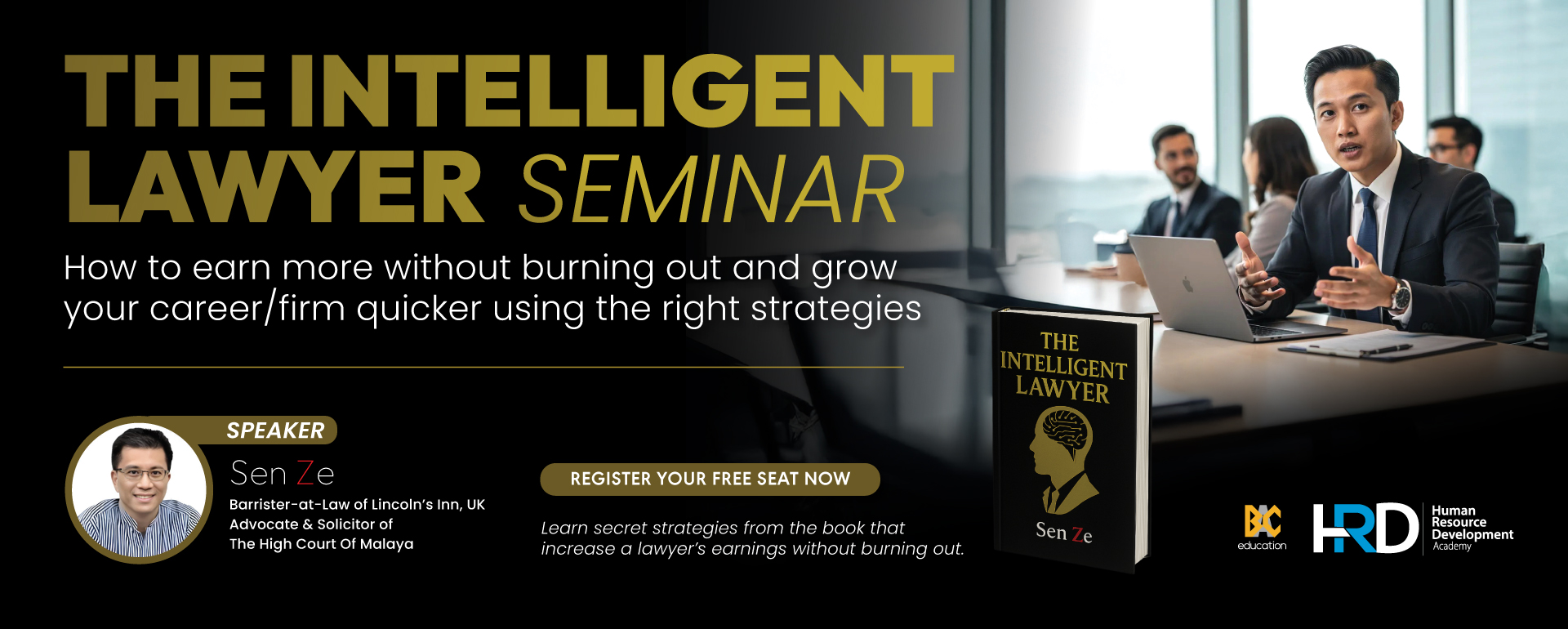 Sen Ze is a Barrister-at-Law from Lincoln’s Inn, an Advocate & Solicitor of the High Court of Malaya, the author of the new book, The Intelligent Lawyer, the founder of The Intelligent Lawyer Inner Circle and the creator of The Super Intelligent Lawyer Programme.