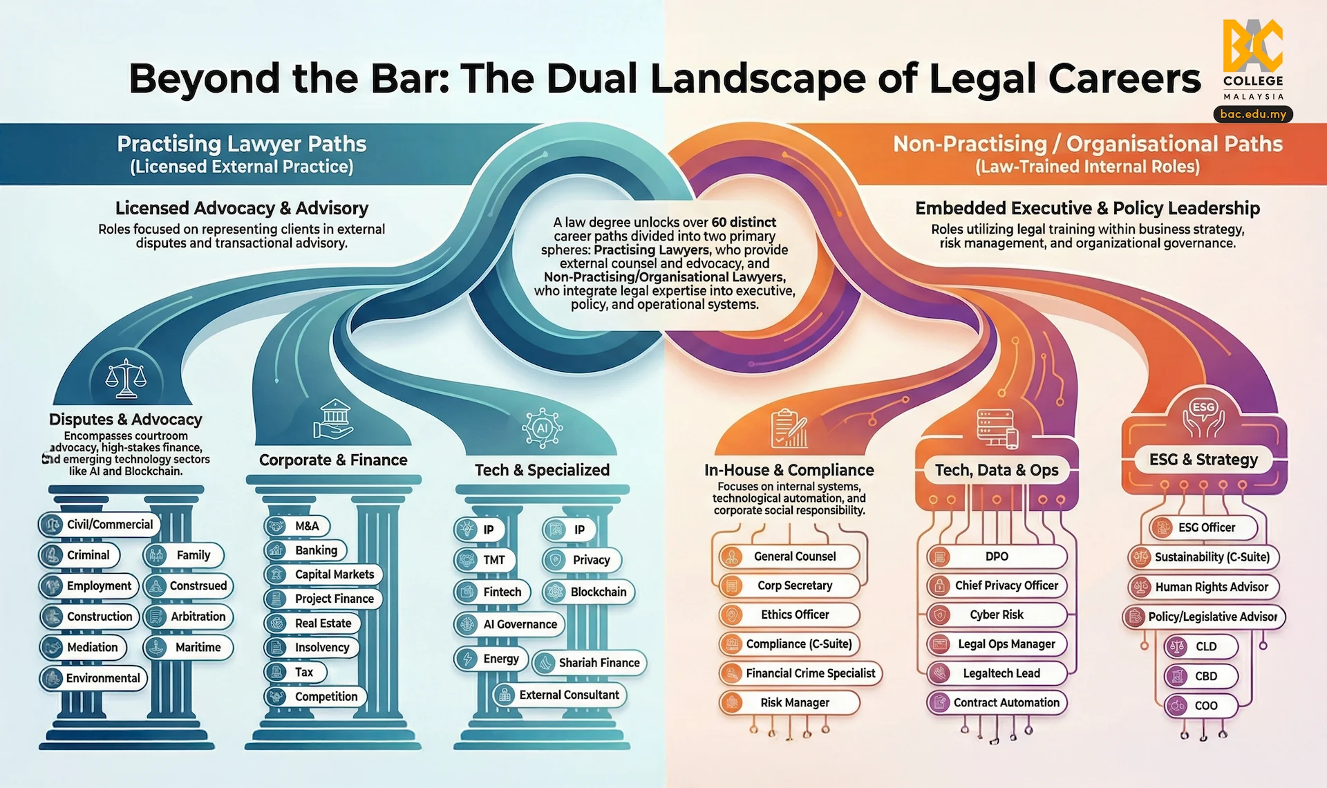 With global career mobility & agility at its core, BAC is a true one-stop centre to over 50 law-related careers, spanning advocacy, corporate law, compliance, governance, legal technology, policy, consulting, entrepreneurship and beyond. Whether your ambition is regional, global, or interdisciplinary, your pathway starts here.